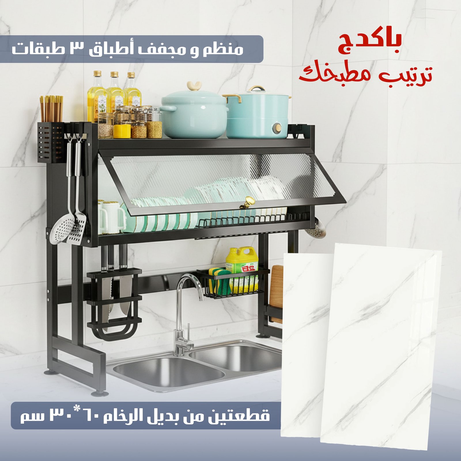 باكج ترتيب مطبخك ( قطعتين من بديل الرخام ٦٠*٣٠ سم مع منظم ومجفف أطباق 3 طبقات )